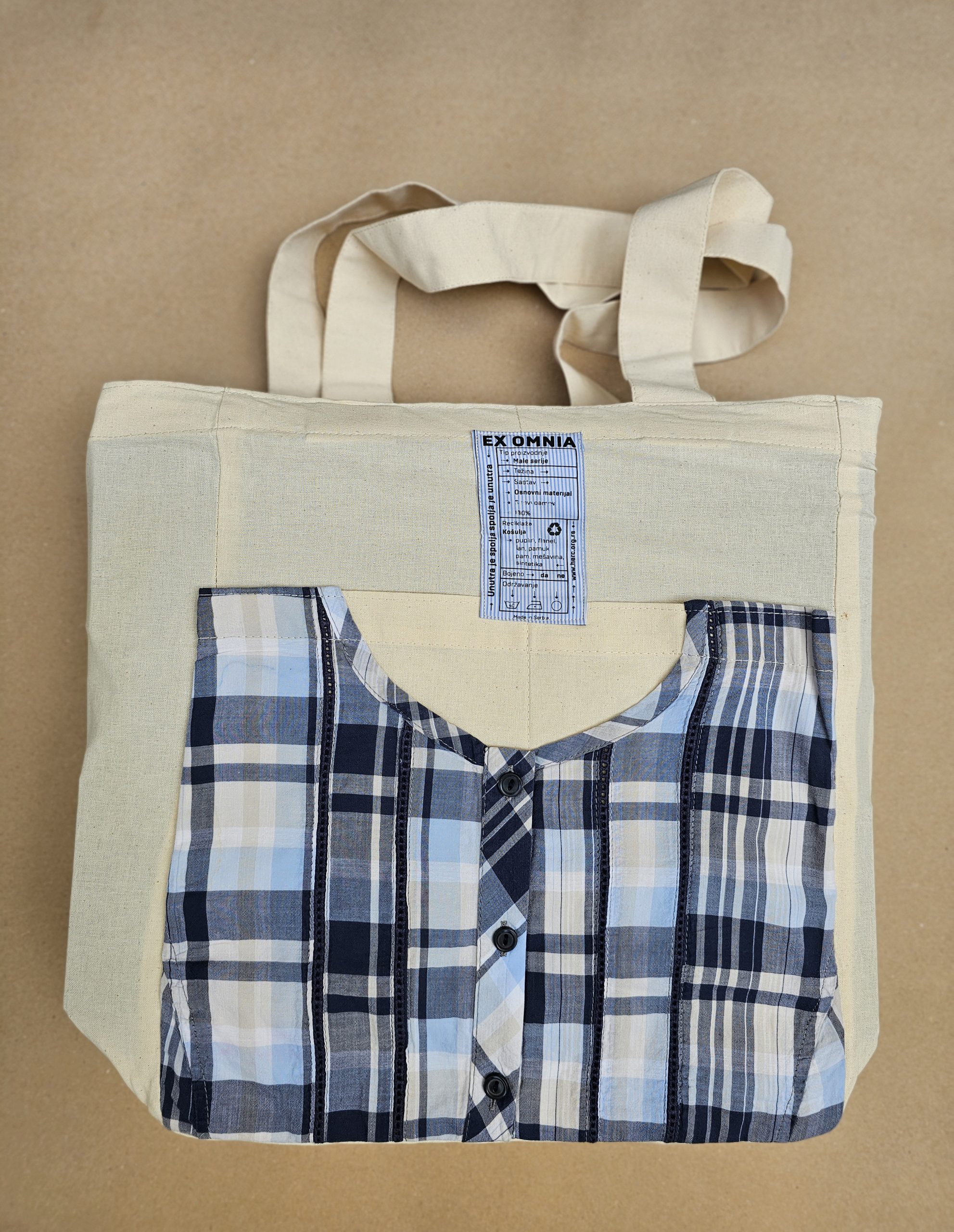 Velika platnena torba za namirnice sa dva para ručki , izrađena od kombinacije sirovog pamućnog platna i reciklirane košulje. Za višekratnu upotrebu. Ukoliko ne nosite cigle u njoj, torba Vam može služiti veoma duga.