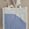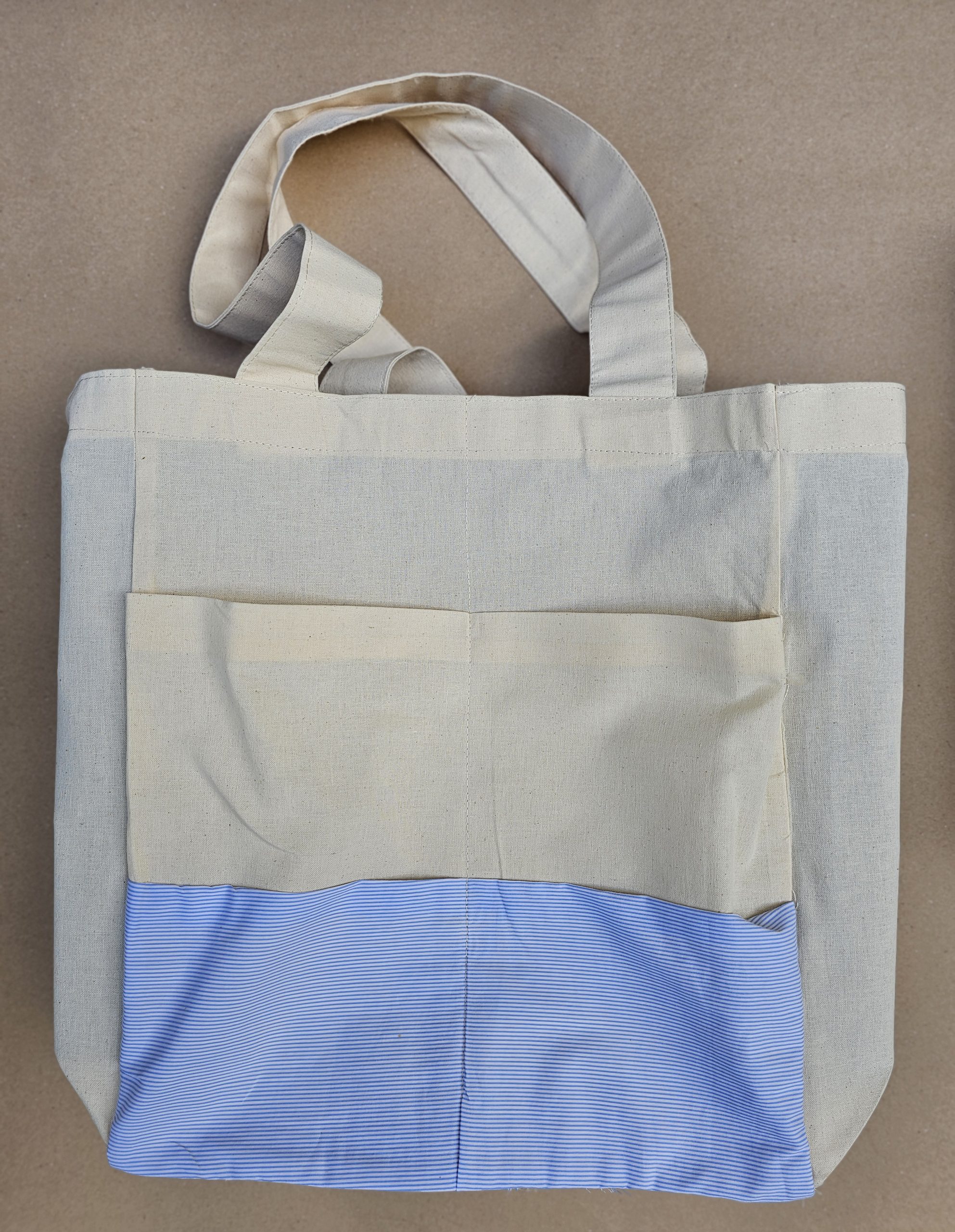 Velika platnena torba za namirnice sa dva para ručki , izrađena od kombinacije sirovog pamućnog platna i reciklirane košulje. Za višekratnu upotrebu. Ukoliko ne nosite cigle u njoj, torba Vam može služiti veoma duga.